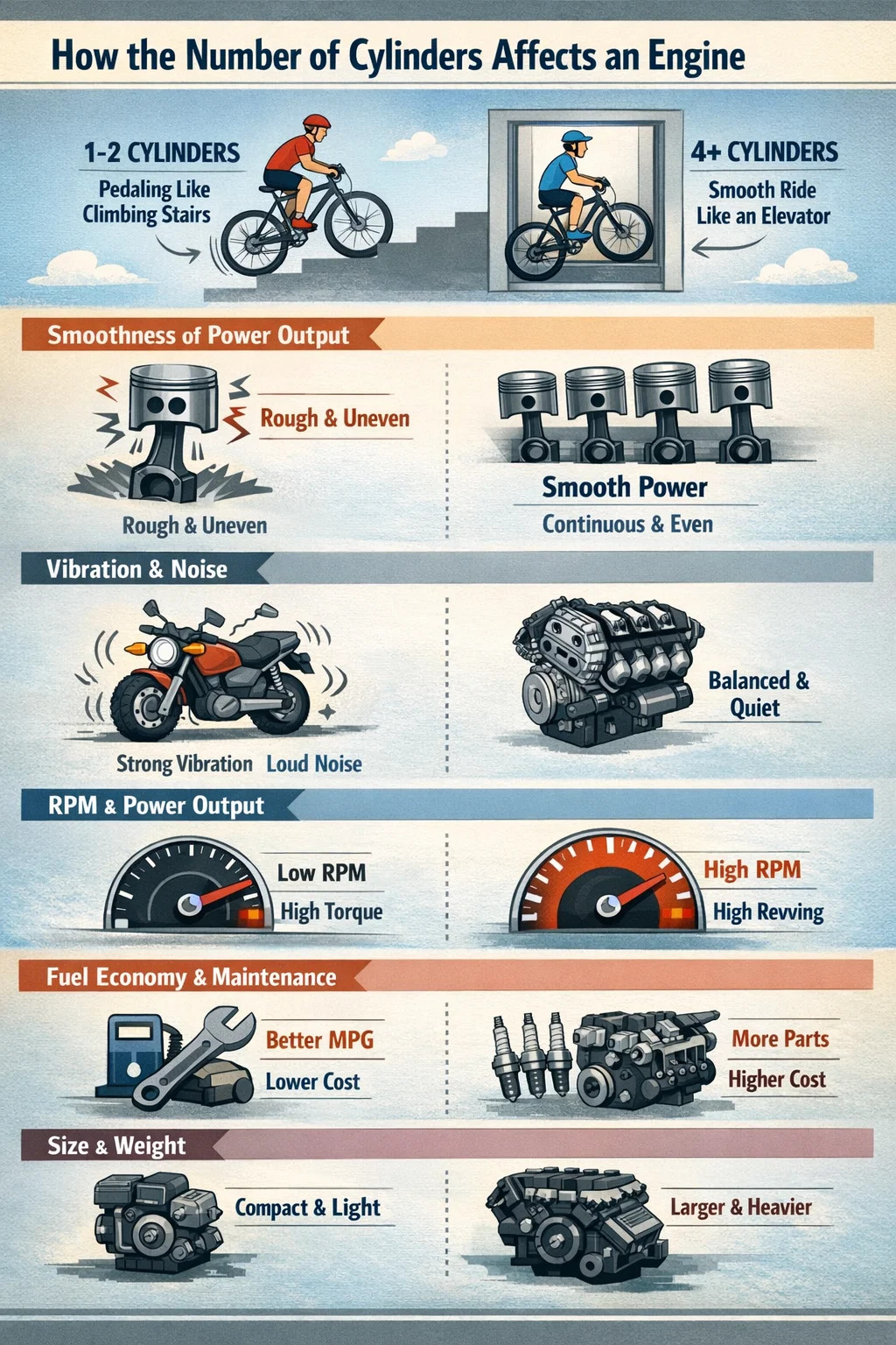 Jalostus: Moottoreilla, joissa on vähemmän sylintereitä, on suurempi vaikutus jokaisella palamiskerralla, ja tärinä on suorempaa (siksi jotkut suuret yksittäiset sylinterimoottoripyöriä voi aiheuttaa käsien puutumista pitkän ajon jälkeen). Kun sylintereitä on enemmän, jokaisen palamisen voima on pienempi, ääni on hienostuneempi ja se on hiljaisempi tyhjäkäynnillä.