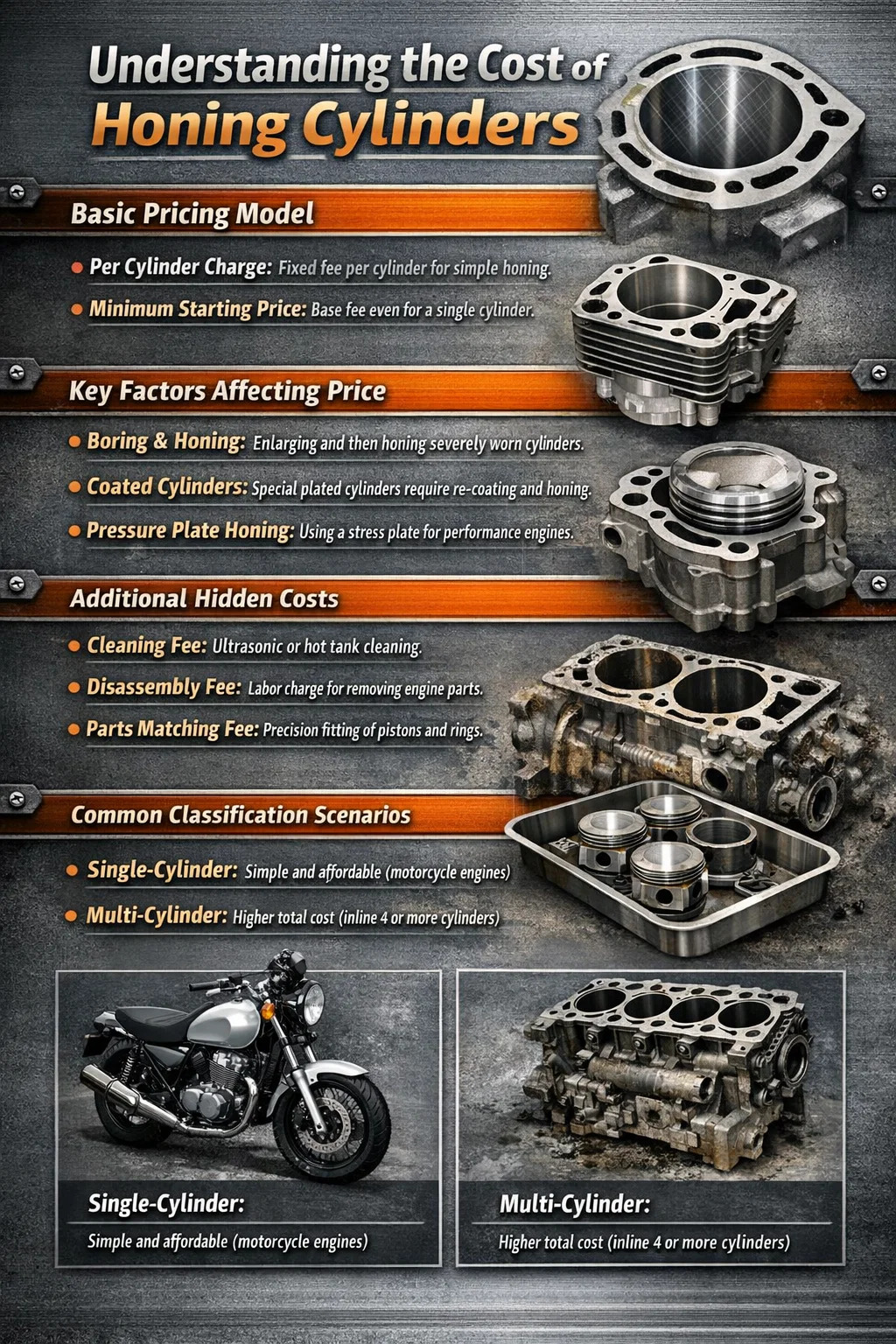 Sylinterikohtaisesti ladattu: Tämä on yleisin malli. Tyypillisesti kauppa veloittaa kiinteän maksun sylinteriä kohden. Jos tarvitset vain yksinkertaista "ristiviivousta" (pintakuvion palauttaminen männänrenkaan tiivistämisen helpottamiseksi), sylinterikohtainen hinta on suhteellisen alhainen.