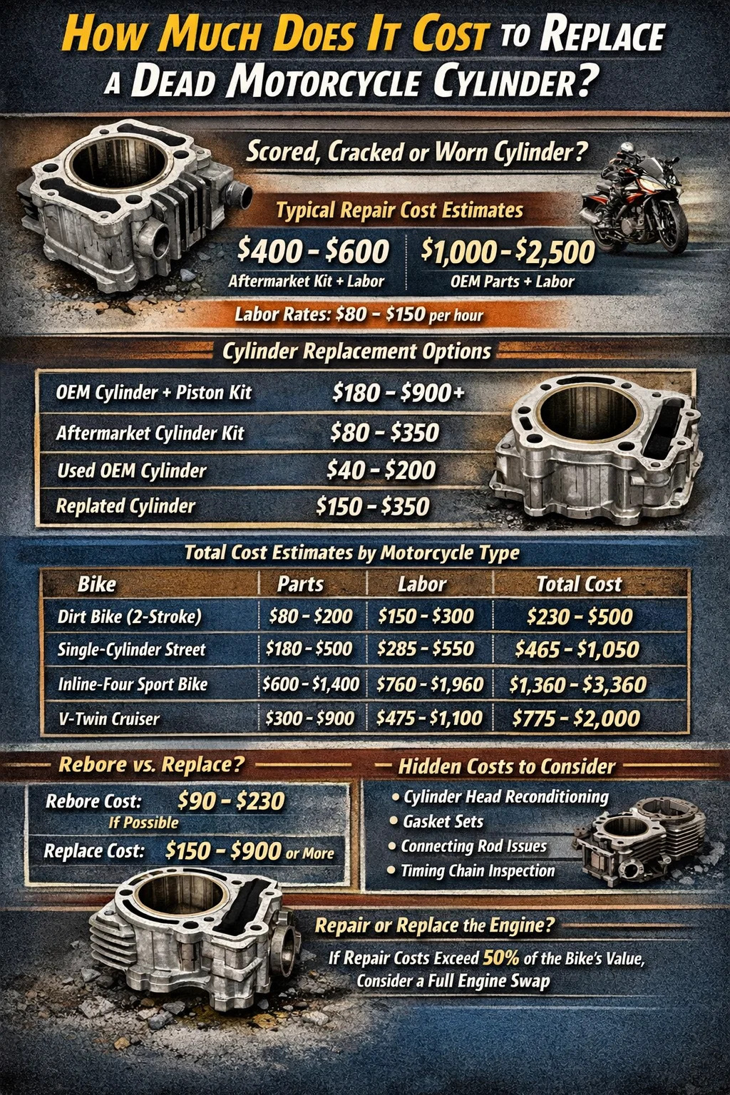 Jos moottoripyöräsi sylinteri on juuttunut, haljennut tai kulunut yli vaatimuksia, katsot korjauslaskua, joka vaihtelee yleensä 300–1500 dollaria tai enemmän , riippuen moottorityypistä, vaihtosylinterin tai -sarjan hinnasta ja liikkeesi työmäärästä. Pienessä yksisylinterisessä työmatkapyörässä budjettiystävällinen jälkimarkkinasylinterisarja voi maksaa vain 80–150 dollaria osista. Suuritilavuuksisessa kaksois- tai nelisylinterisessä urheilupyörässä OEM-sylinterikomponentit voivat painaa yli 600–900 dollaria, ennen kuin mekaanikko ottaa avaimen käteensä. Lisää työvoimaa – joka yleensä maksaa 80–150 dollaria tunnissa – ja työ, joka kestää 4–8 tuntia, niin kokonaiskustannukset nousevat nopeasti.