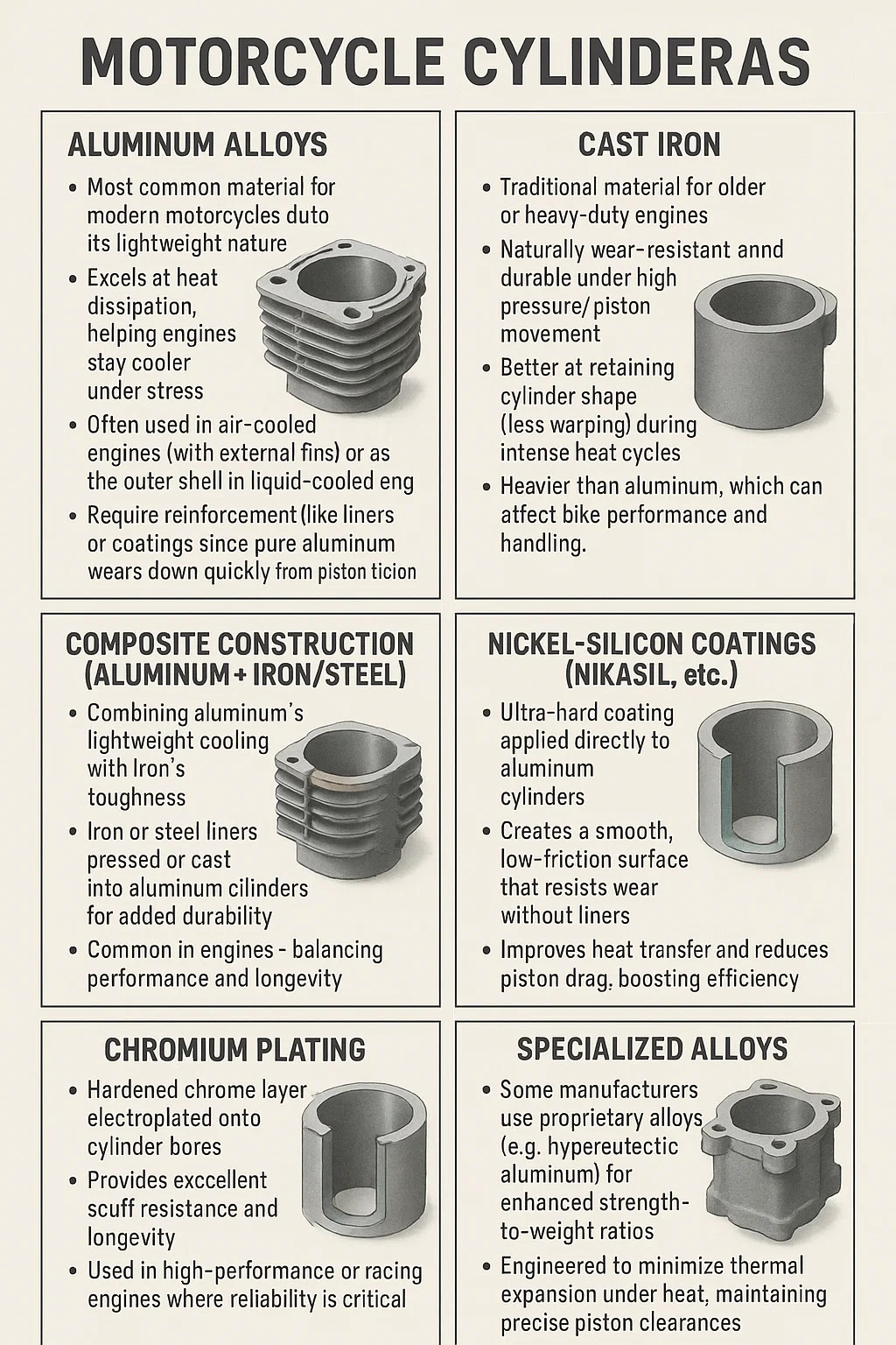 Moottoripyörän sylinterit Valmistetaan ensisijaisesti metalleista, jotka on valittu lujuuden, lämmönkestävyyden ja kestävyyden vuoksi. Tässä on yksityiskohtainen erittely yleisistä materiaaleista ja niiden ominaisuuksista: